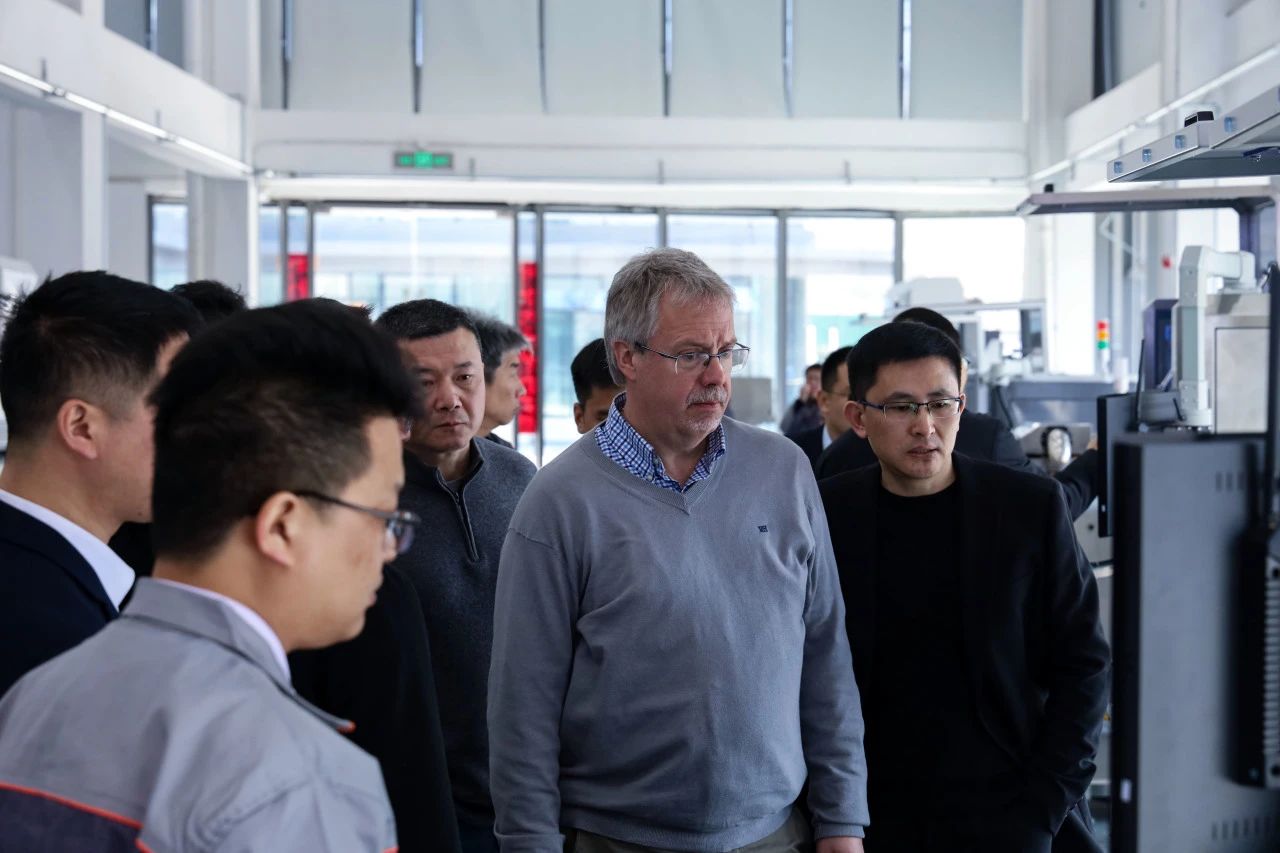 隨后帶領曼盛包裝全球CEO Hansulrich Zellmer一行實地參觀設備展廳、生產制造車間,現場演示多款包裝領域AI視覺檢測設備以及設備生產制造全流程工藝。