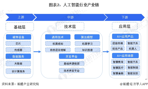 人工智能產業鏈上游為硬件設備和數據設備,其中包括芯片、傳感器、大數據、云計算服務等,為人工智能提供數據服務和算力支持;中游是人工智能產業的技術核心,包括通用技術、算法模型、開發平臺三個方面,涵蓋了機器感知、自然語言理解、機器學習、圖譜、基礎開源框架等核心技術;下游是人工智能的應用產品和場景,涉及交通、醫療、安防、金融、家居、制造等多個領域。