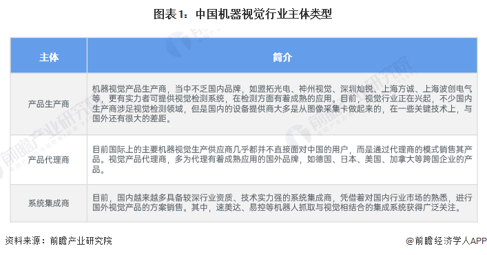 中國機器視覺行業市場主體可分為產品生產商、產品代理商和系統集成商三大類。根據中國機器視覺產業聯盟(CMVU)調查統計,現在已進入中國的國際機器視覺品牌已近200多家(如康耐視、達爾薩、堡盟等為代表的核心部件制造商,以基恩士、歐姆龍、松下、邦納、NI等為代表的則同時涉足機器視覺核心部件和系統集成),中國自有的機器視覺品牌也已有100多家(如海康、華睿、盟拓光電、神州視覺、深圳燦銳、上海方誠、上海波創電氣等),機器視覺各類產品代理商超過300家(如深圳鴻富視覺、微視新紀元、三寶興業、凌云光、陽光視覺等)。