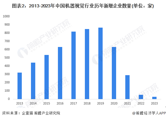 根據中國企業數據庫企查貓,截至2024年6月12日,中國機器視覺行業的主要企業共7395,其中以2017-2019年為主要注冊熱潮,2019年注冊企業數量為891家,數量最多。2020-2023年新增企業數量呈下降趨勢,2023年機器視覺新增企業數量不足30家。