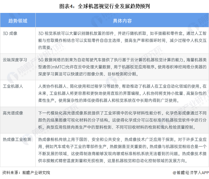 近年來,人工智能、大數據、3D成像和機器人過程自動化等領域在取得了空前的發展。未來,機器視覺技術應用還將蓬勃發展,在3D成像、云端深度學習、工業機器人、高光譜成像和熱成像工業檢測等方面得到更深層的應用,推動機器視覺相關技術在各個領域的的需求不斷增長。