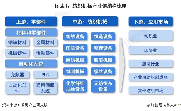 中游是細分產品,包括紡紗設備、織造設備、印染設備、整理設備、麻紡機械、縫制機械、化學纖維抽絲設備、無紡織布設備等。下游則是紡織業、印染業、服裝行業、產業用品等行業。