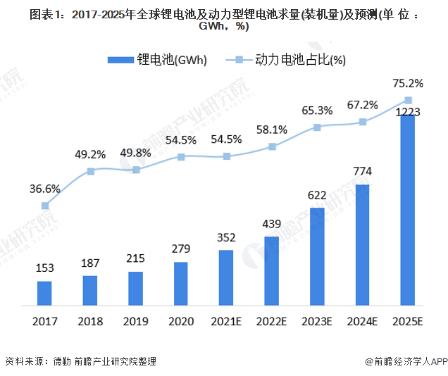 預計隨著電動汽車全球滲透率將的不斷提高,2021-2025年的年復合增長率達34.4%,2025年,全球鋰電池整體需求量將達到1223GWh,動力電池占比達75.2%。