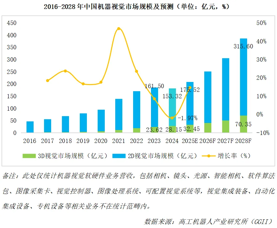 根據GGII數據顯示,2024年中國機器視覺市場規模181.47億元,其中3D 視覺市場約為28.15億元,同比增長19.18%。而2025年中國機器視覺市場規模有望突破210億元,同比增速超14%,預計至2028年我國機器視覺市場規模將超過385億元,2024-2028年復合增長率約為20%。